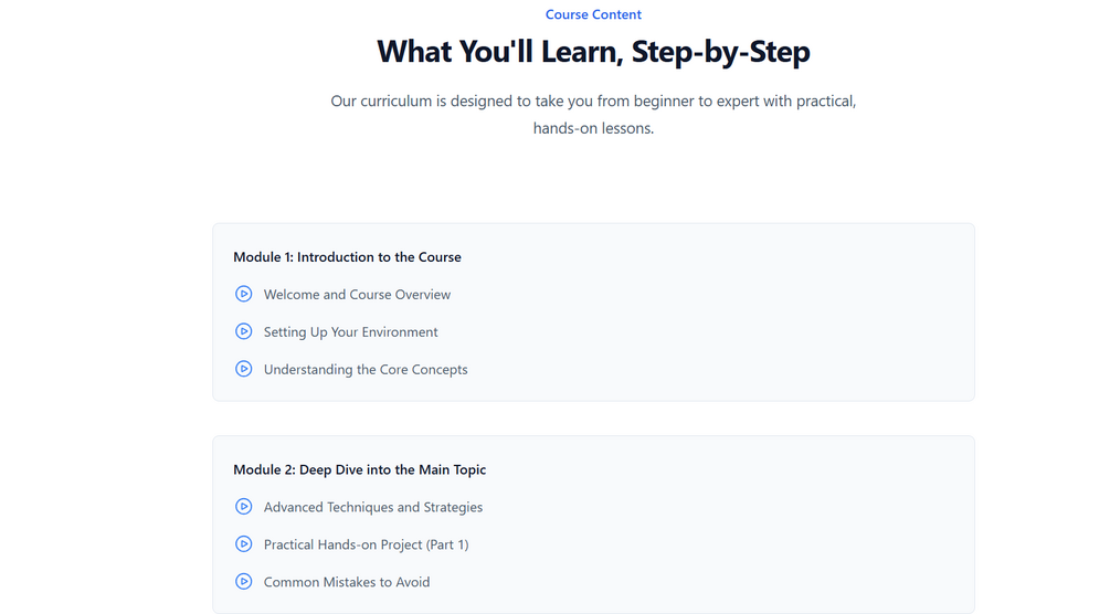 • Sleek, Modern Design: A clean and professional layout that makes your course look top-tier.